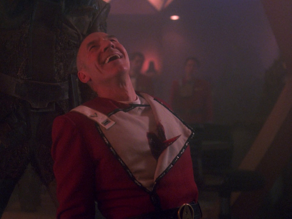 One of the best scenes involves Picard avoiding getting stabbed, but finding out he’s alienated his friends at the same time, and is brought to the present as a lowly science officer. The other best scene is Q’s speech about why when Picard objects: