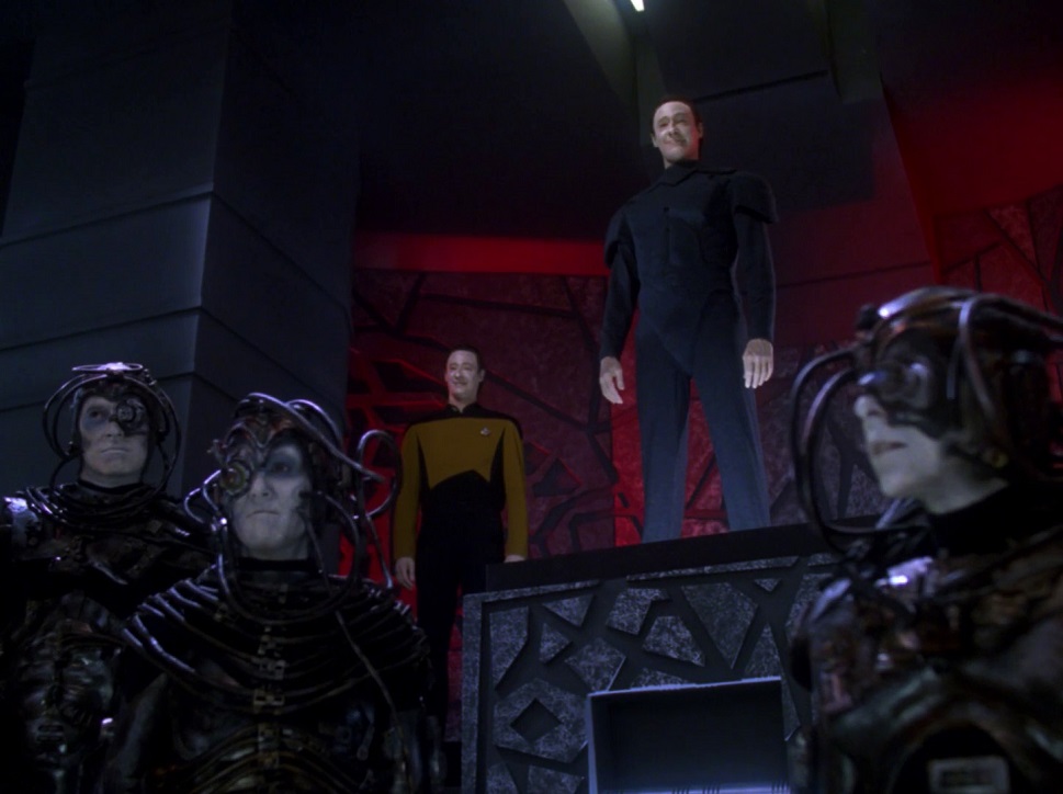 Plot A and B Analysis:  The four-and-a-half-minute teaser covers a lot of ground. Data is playing poker with Isaac Newton, Albert Einstein and Stephen Hawking, and it’s very cool. The Enterprise is called to defend a colony that is being attacked, and when they beam down they find…a Borg! Plot A is about the Borg and Data, there is no plot B. In fighting off the Borg, Data get angry and kills one! The ship gets away using an unknown technology, and in the aftermath Data tries to understand his emotional response. Admiral Nechayev shows up, rips Picard a new one for letting Hugh go back in I Borg, and Data seeks out Troi for help. In session he admits to feeling pleasure after killing the Borg(!). The Enterprise finds the Borg ship again–a little too easily–but when they try to get away this time Picard pursues them through the energy matrix they used. After the Borg send two drones over as a diversion one is captured, and shortly thereafter he is manipulates Data into smuggling them both off the ship and taking a transwarp conduit, which is how the Borg can zip around so fast. Picard wants to follow again and Geordi figures out how they can enter it themselves. Chasing Data and the Borg they find a planet which they can’t scan due to interference from the atmosphere, so they go down and search only to find a building full of 50 Borg (which Geordi predicted with uncanny accuracy)–along with Data and Lore! Despite some risky precedent-setting and questionable plot twists, the 45 minutes move quickly along and sweeps the audience toward the cliff-hanger ending.