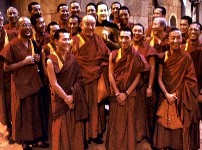 Behind the Scenes/Trivia:  This was actually the first episode made for season three, not Evolution. In an interview with Melinda Snodgrass she said she was given the directive that Data was supposed to make love to the girl who had a crush on him. “He is fully functional you know” Roddenberry said to her, “I don’t want her to just have a crush on him, I want him to sleep with her.” However the budget was cut by $200,000 at the last minute so that whole scene went, and thank goodness. That would have been weird. The title of this episode is from a poem by John Quincy Adams called “The Wants of Man.” While they were filming this episode the entourage of the 14th Dalai Llama’s visited the set and took a photo, which I’ve posted above. That’s cool. Believe it or not Grainger Hines, who played Gosheven, had all of his dialogue dubbed by another actor because he didn’t like his vocal performance. What the heck? Also, this is the second episode of the series where no stardate is ever given.