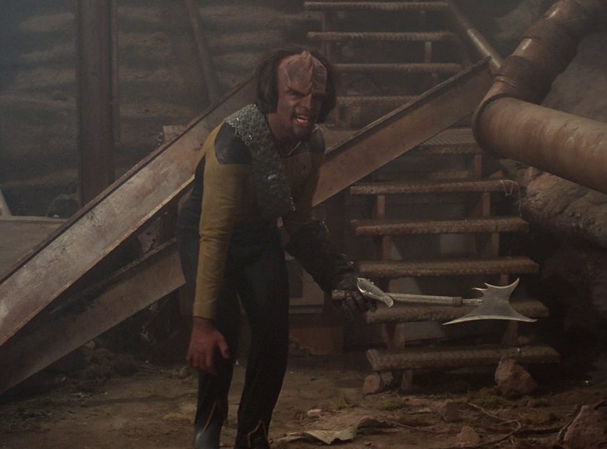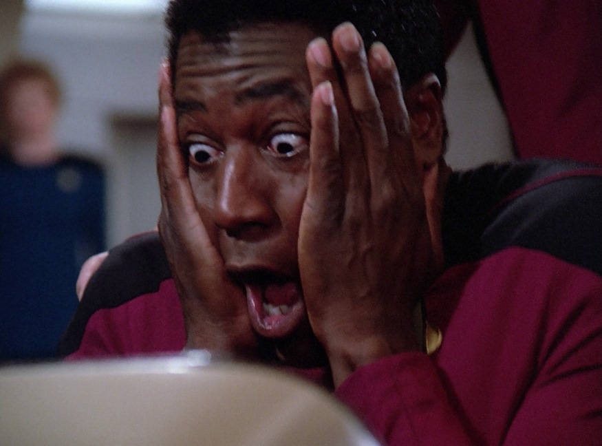 Use of Cast/Characters: Pulaski doesn’t waste time trying to irritate us: “it does know how to do these things, doesn’t it?” in reference to Data working at Ops, and Picard defends him to her. “Forgive me, I’m not accustomed to working with nonliving devices…forgive me again, your service record says that you are alive. And I must accept that.” This is the first time we see Geordi transferring engineering to the bridge so he can be on the bridge. Get used to it, it will happen quite a few times this season. Having said that, Geordi doesn’t really do much once he’s there. Picard’s experience in dealing with unknown situations is on display here, and he demonstrates why he’s the guy you want as your captain. Riker’s personality starts to get shown a bit more, which is good; he handles Worf well but still gets a bit discombobulated later, showing that he is still growing. Data has a little to do, but not much and Wes has less, much like Troi. Worf gets perhaps the most character development in this episode, and it will inform him as the series progresses. Colm Meaney makes another appearance as the transporter chief but he still doesn’t have a name yet.