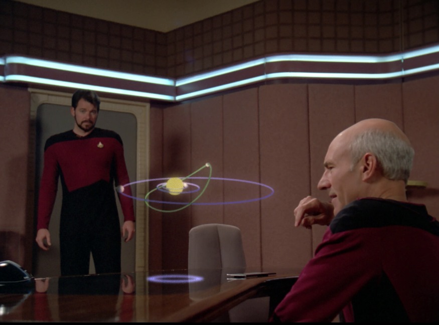 Nitpicks: The little discussion in the teaser about some aberrant third planet in a solar system makes absolutely no sense. Also the fade out is just odd, as if the director didn’t know what else to do, or couldn’t think of a better way to end the teaser. Man that Riva has some 80’s hair! He immediately hits on Troi, but just comes across as creepy. She is saying that it’s flattering and she’s interested, but I can’t see it at all in her performance. Later when his chorus is about to be killed, how slow is that guy on the draw that Riker and everyone moving even slower have time to get him out of the way? That’s a sign of bad editing. Later, after Data learns sign language why is he needed to translate when Picard speaks to Riva? They didn’t need him so Riva could understand up until that point? About 11:30 into the episode Geordi is just standing on the bridge for no reason and you can see his shadow on the turbolift doors, obviously from a stage light.