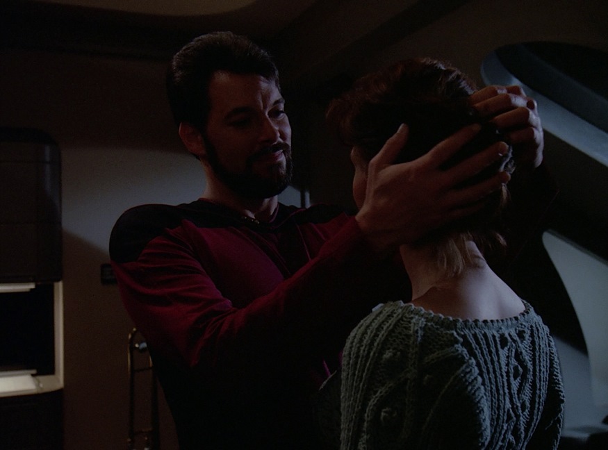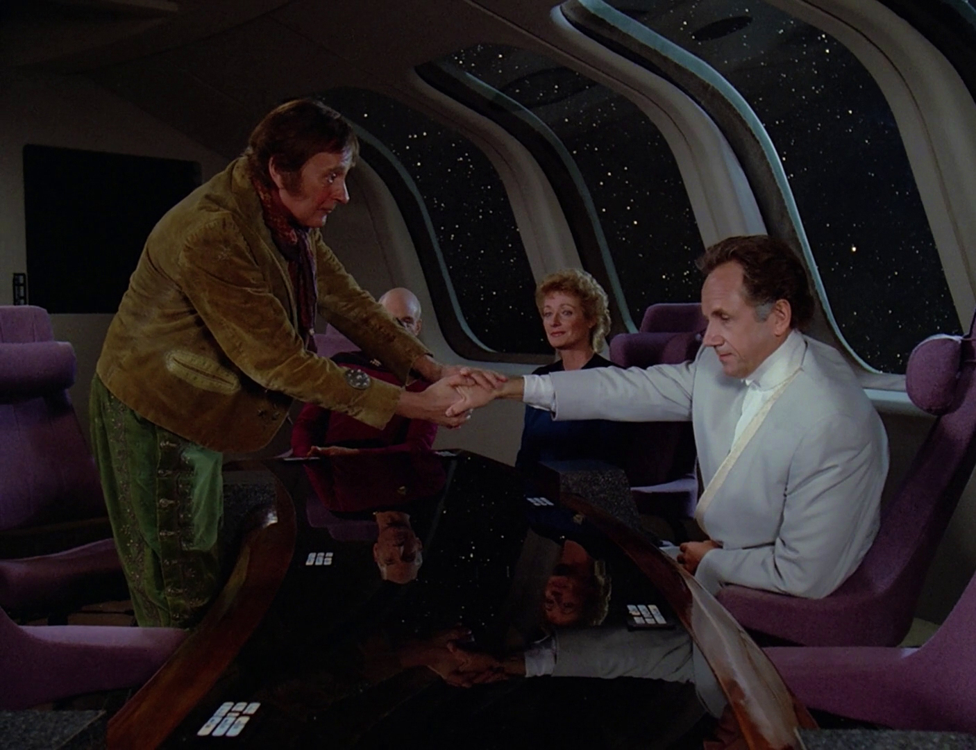 Nitpicks: I’m not sure why these actors mispronounce “hegemony,” but they do. The distress signal is never explained, except in a deleted scene. When Wilson Granger from the second colony is meeting in the observation lounge, why isn’t Troi there? She’d have been able to determine some of what he was scheming, and it’s appropriate for her to be there anyway. It’s so obviously a plot device how Geordi just shows up for no reason about 3/4 of the way through the episode, then promptly disappears. He serves almost no purpose, so I guess the writers didn’t know what to do with him. Lastly plot B could have been developed a bit more, or at least spread out a bit in the episode, heaven knows this plot could use something interesting happening. Maybe the scene with the tea ceremony could have taken place toward the end? Bad editing in any case.