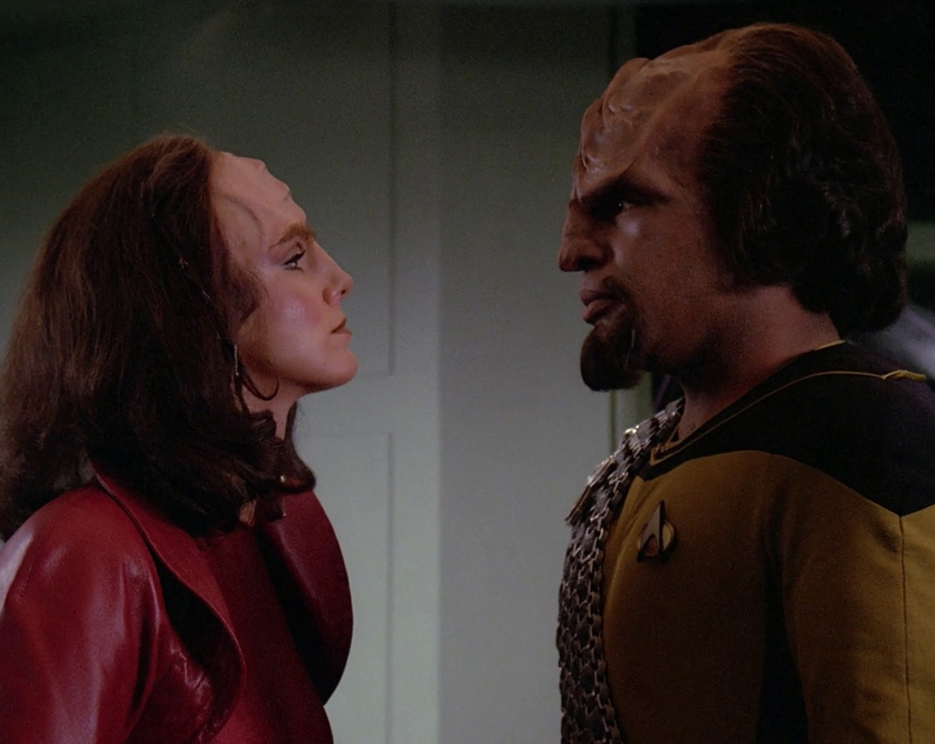 This is also the second and final episode that Anne Ramsay is in; she goes on to star in Mad About You not long after I believe. Here’s an Easter egg:  see if you recognize the actor playing the tactical crewman on the bridge in the middle of the episode. He’s Diedrich Bader. According to IMDB it was only the third acting job he’d ever had, but he’ll go on to play Oswald on the popular Drew Carey Show, Lawrence in the movie Office Space, Rex the karate instructor in Napoleon Dynamite as well as several others. One final bit of info: Worf’s son Alexander was born on 43205 (as we learn in New Ground), which is only three months or so after this episode take place. This means not only did they definitely have sex in this episode, but the Klingon gestation period is pretty freaking brief!