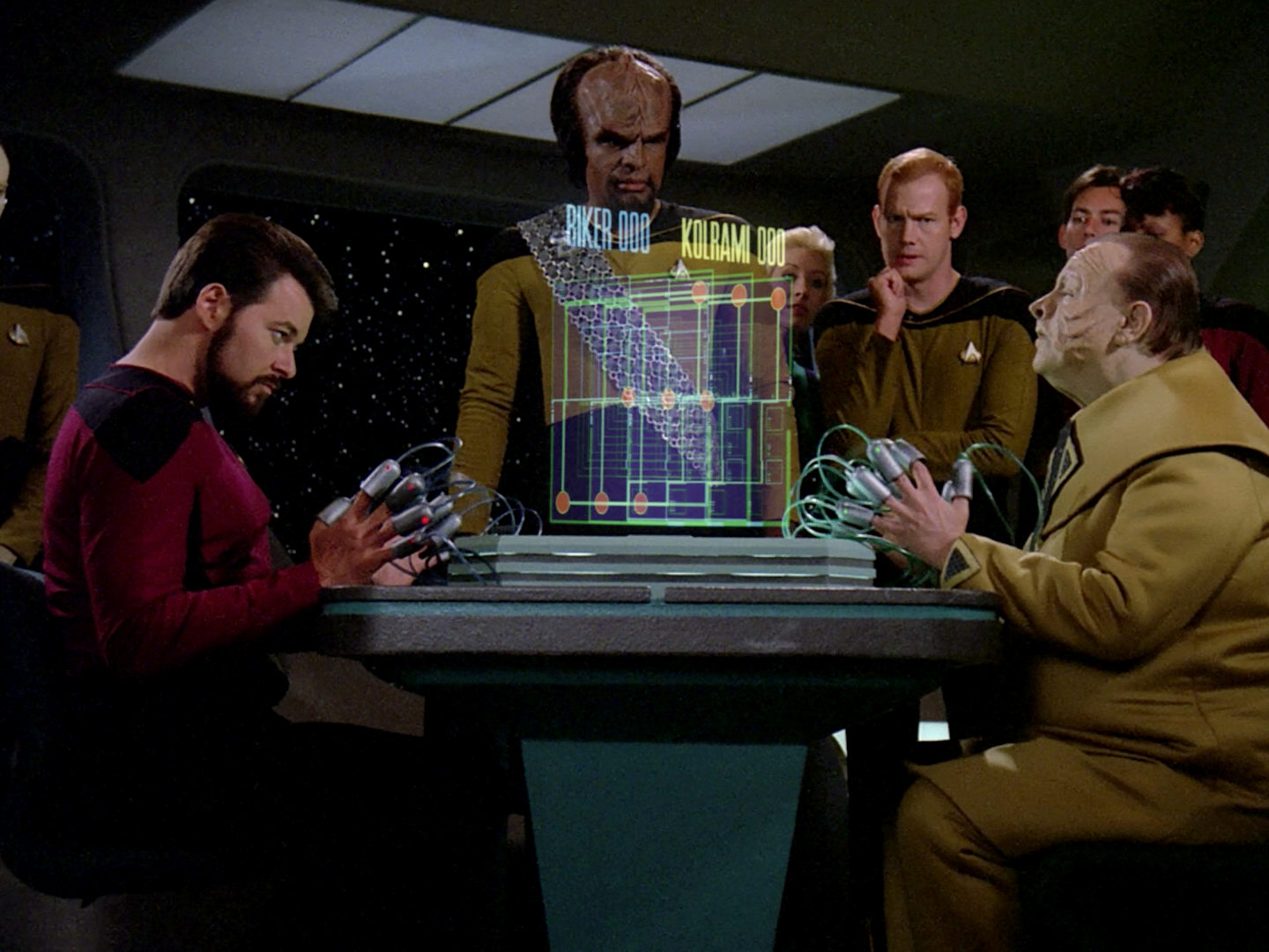 Plot A and B Analysis: The teaser here sets up the episode with excellent efficiency: Picard agrees to have a mock battle with Riker, who will be captaining the Hathaway to hone their combat skills in light of their encounter with the Borg. Plot A is about the training exercise, there is a kind of sub-plot B about Kolrami and the game strategema. Kolrami is the puffed-up Zakdorn Federation strategist who will be grading their performances, and he’s rather disdainful of Riker. He then destroys him at the game Strategema after Riker’s challenge. Riker proceeds to take all the officers off the Enterprise except for Data and they start pimping the Hathaway up. Meanwhile we detour to watch Data get spanked by Kolrami and then spends most of the episode whining about it, and Troi, Pulaski and finally Picard has to step in to remedy the situation. The plot plods along in a somewhat interesting manner as both sides prepare until we get to the battle simulation, where there is some action. Unfortunately an annoying adversary shows up and the resolution is full of holes.