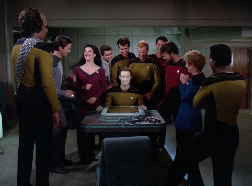 Favorite Scenes: Picard’s defense of Riker in his ready room to Kolrami is nice, and it’s where he refers to Riker as “the finest officer with whom I have ever served.” There is a little bit of comedy in the scene with Data and Troi, which isn’t bad. The best scene of the episode is at the very end, where Data “busts up” Kolrami.
